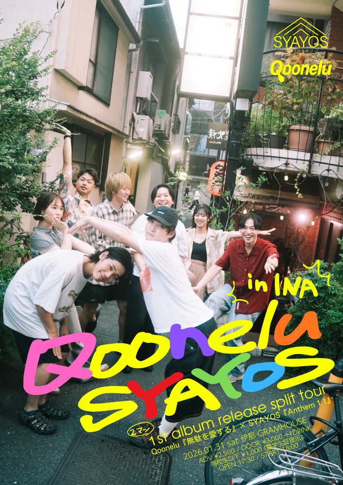 Qoonelu×SYAYOS sprit tour『伊那編』 SCHEDULE 2026/01/31(土) 伊那GRAMHOUSE OPEN17:30/START18:00 チケット予約 URLをコピーする 報告する